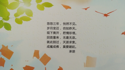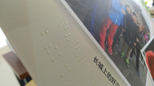 一個(gè)架子上,放著一疊厚實(shí)的精裝冊子,封面寫著“2018屆貳家紀(jì)念冊”。翻開冊子,與以往見到的一樣,紙面印著一張張燦爛而純真的笑臉和一些文字,不一樣的是,紙面上還多了一些微微凸起圓點(diǎn),大約厚度1mm左右,按一種特有的規(guī)律排列,看起來晶瑩剔透,用手撫摸一下,顆粒感很真實(shí),這就是“盲文畢業(yè)紀(jì)念冊”。