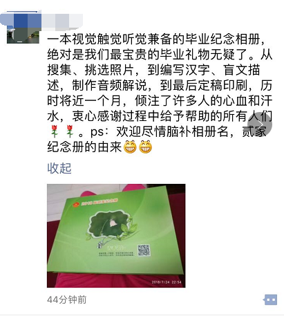 感謝所有為“盲文畢業(yè)紀(jì)念冊”做出奉獻(xiàn)的人,因?yàn)槟銈?,世界更美麗。掃描封面二維碼,聆聽2018屆貳家畢業(yè)班同學(xué)的校園故事,不知不覺,熱淚盈眶,感動(dòng)之余,我明白了“讓印刷走進(jìn)千家萬戶,為幸福生活添色加彩”的真實(shí)含義。